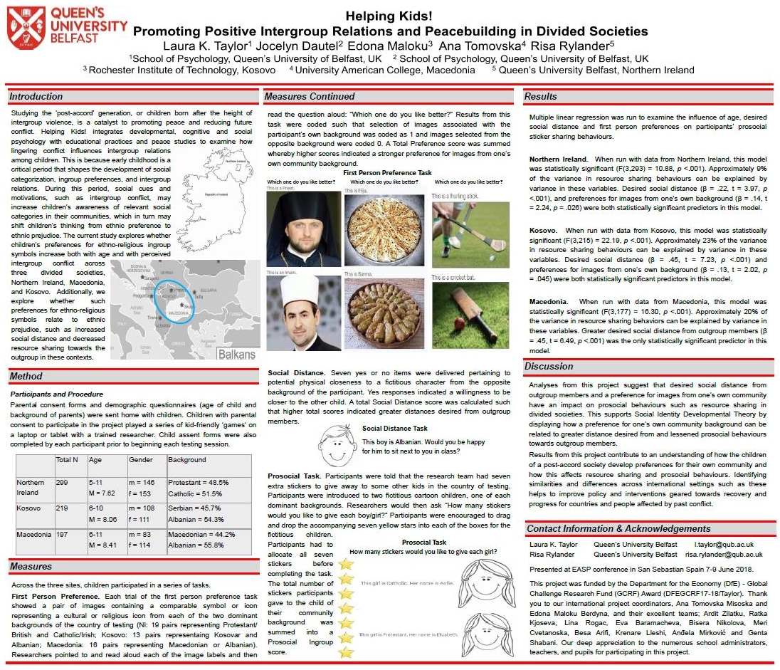 The Helping Kids! lab will continue to identify antecedents of children’s peacebuilding in divided societies. Fostering positive outgroup attitudes and opportunities for outgroup helping may have promising, long-term implications for more constructive intergroup relations. Through discussions with families, schoolteachers and administrators, non-governmental organisations and government officials, we hope our findings can inform public policies that aid children living in conflict-affected areas around the world. As a result, our findings may help inform peacebuilding interventions in schools and communities, with the long-term aim of fostering more cohesive societies.
