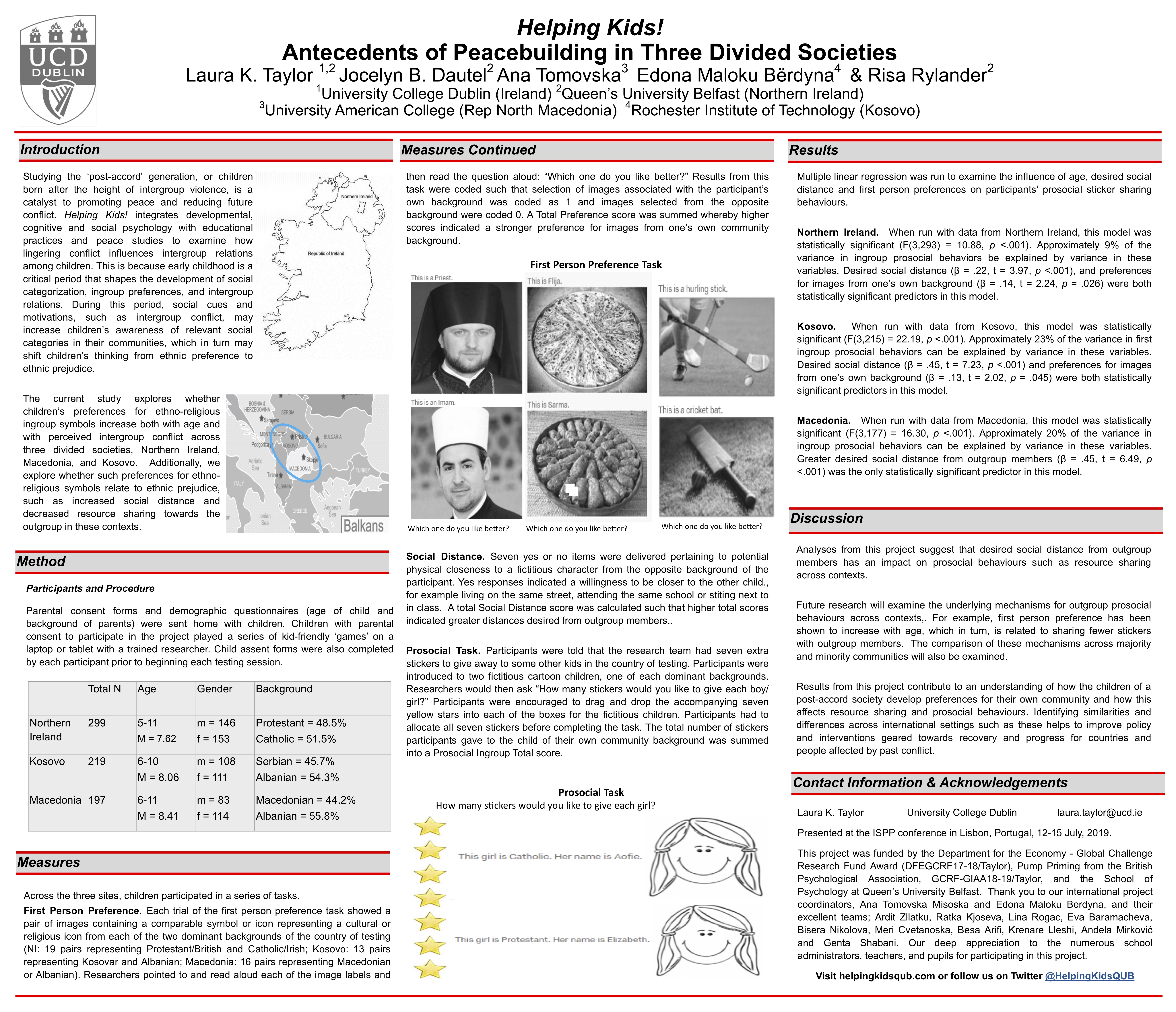Taylor, L.K., Dautel J., Maloku, E., Tomovska-Misoska, A., & Rylander, R. (2019, Mar.) Helping Kids! Antecedents of Peacebuilding in Three Divided Societies. Poster presented at the International Society for Political Psychology (ISPP), Lisbon, Portugal.