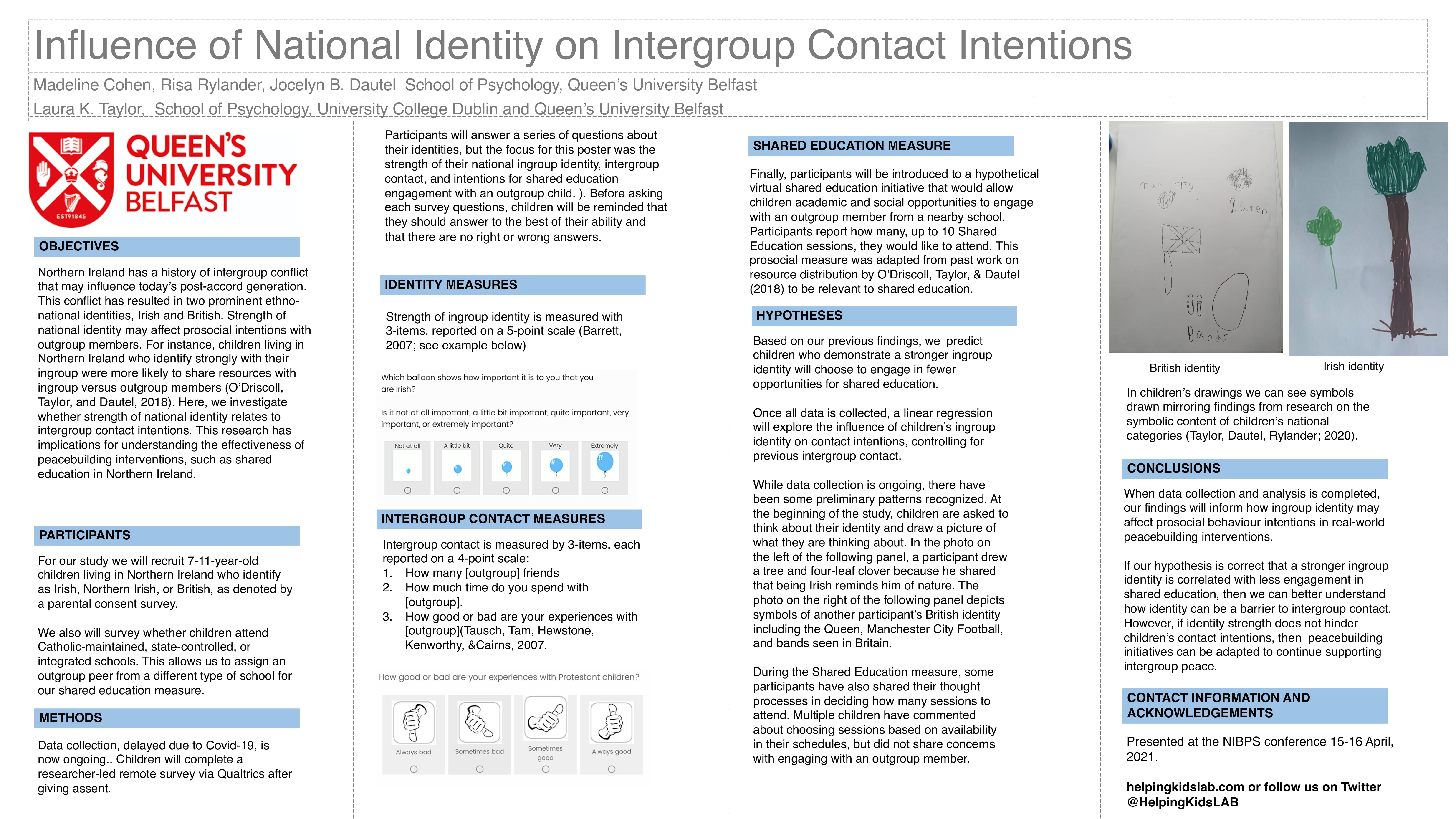 Cohen, M., Rylander, R., Dautel, J. B., Taylor, L. K. (2021, April). Influence of National Identity on Intergroup Contact Intentions. Poster presented at the biennial meeting of the Society for Research in Child Development [online].