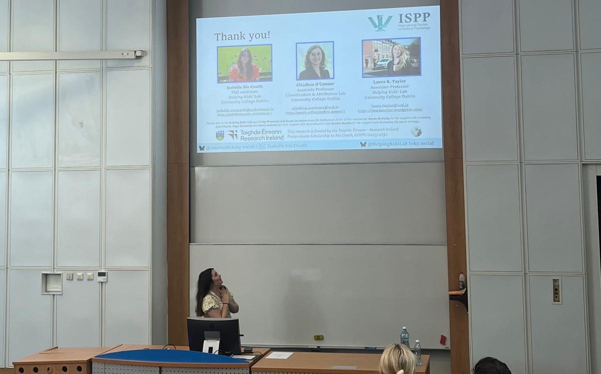 Nic Craith, I., O’Connor, C., & Taylor, L. K. (2024, December 2). A Systematic Review of the Relationship Between National Identity Content and Attitudes and Behaviours Towards of Immigrants Among Children, Adolescents and Young Adults. [Poster presentation]. UCD School of Psychology 3rd Annual Aidan P. Moran Research Day, Dublin, Ireland.